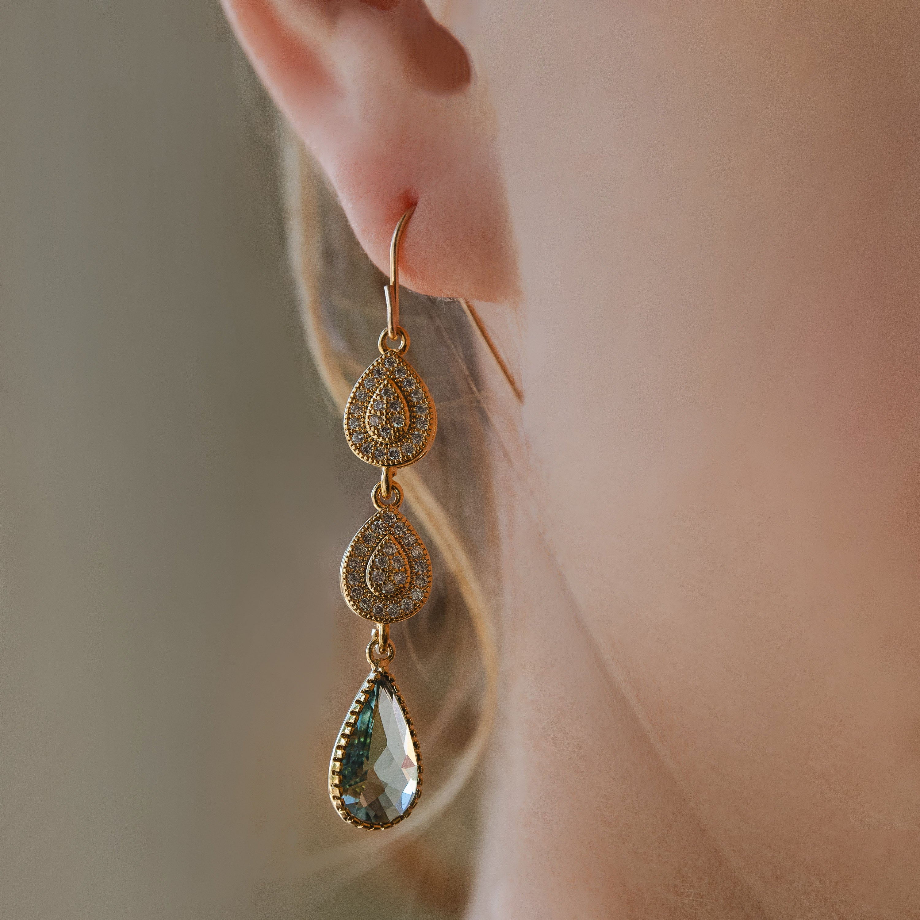 Miel earrings showcase a graceful cascade of clear and charcoal cubic zirconia stones. The contrast between luminous brilliance and deep smoky tones create a striking visual composition. Ideal for those who appreciate refined jewelry with contemporary flair and dimensional sparkle.