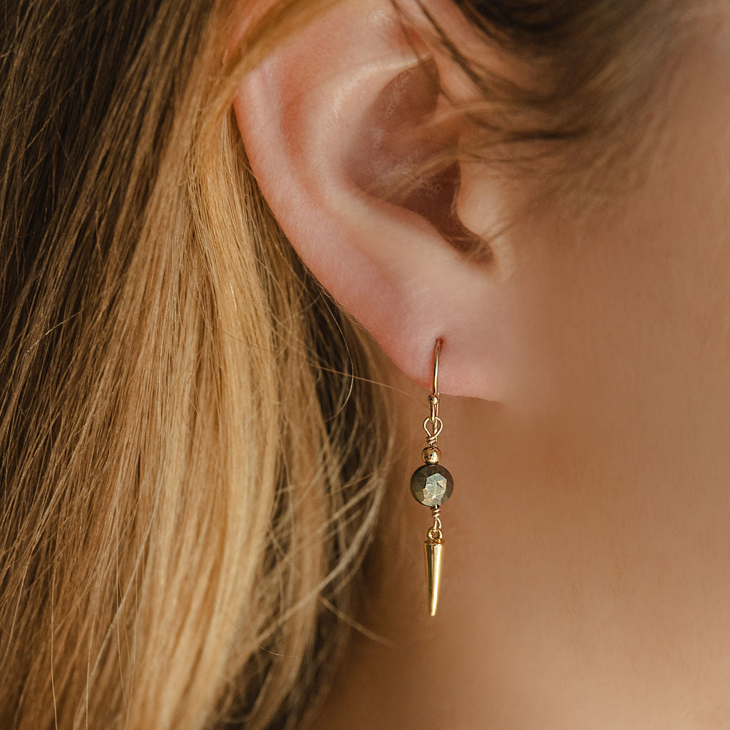 These petite pyrite mini drop earrings are lightweight and easy on the lobes. The stones natural metallic hues are a perfect pairing for the gold. Great worn alone or to incorporate into your favorite ear stack.